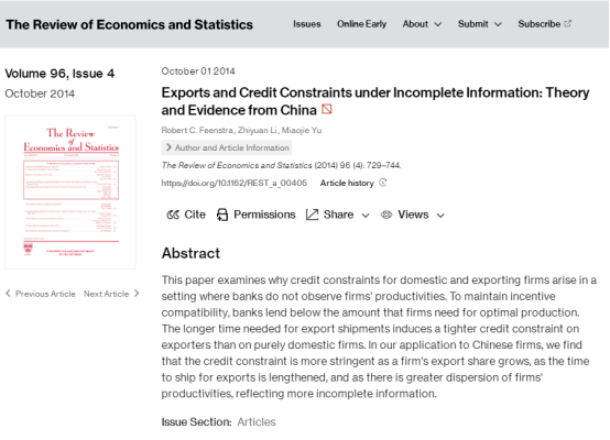 余淼杰教授于2014年10月在该杂志发表了论文“Exports And Credit Constraints Under Incomplete Information: Theory And Evidence From China”,其Google Scholar引用量为767次。该文同时获得第六届张培刚发展经济学研究优秀成果奖。