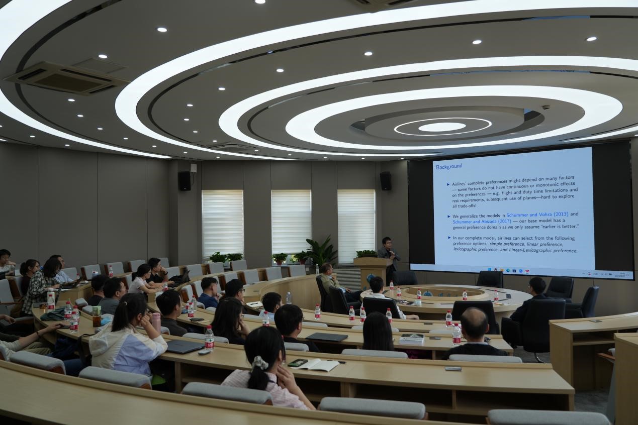 何真瑜教授以自然起源和数学本质为切入点,从多个维度深入阐述了飞机时隙分配问题,并详细介绍了各国在恶劣天气条件下处理飞机时隙分配问题面临的挑战、历史的困境及现行的方法。何教授指出,当机场受到恶劣天气影响时,由于航班降落所需时间延长,原有的航空时间表往往不再适用。因此,相关部门会根据天气预测提前调整机场的接收能力,并重新规划航空时间表。接着,何教授进一步解释了航空公司在面对多班次航班及其各自限制时所展现出的复杂偏好。为解决这一难题,何教授提出了一种创新性的反馈机制。该机制能够在任何分配程序启动前为航空公司提供额外的利益相关信息,从而辅助它们做出更明智的决策,有望显著降低决策成本。最后,何教授展示了一种创新的多层交易循环机制。这一机制允许航空公司根据自身偏好进行选择,为该领域的研究提供了崭新视角。